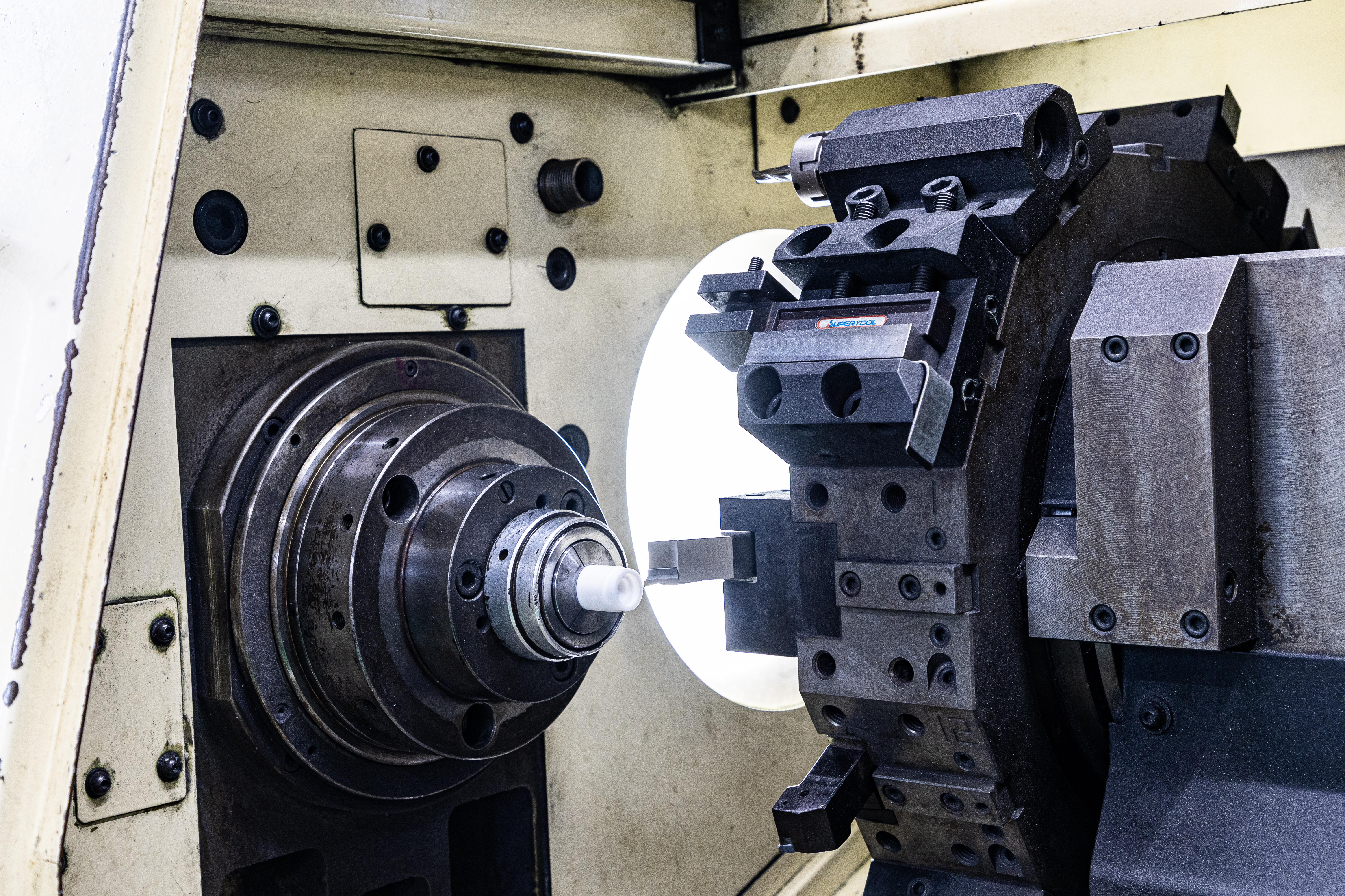 FANUC21i-TB制御+中空チャック搭載 安定した制御と、自動給排気対応の中空チャックで多様な加工に対応可能。